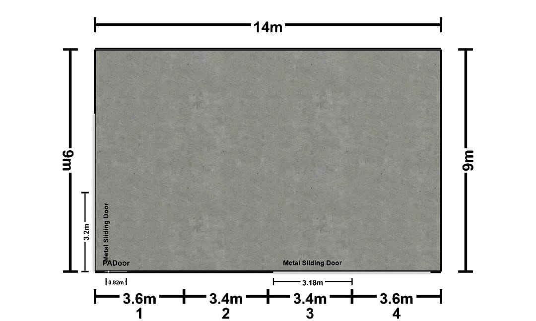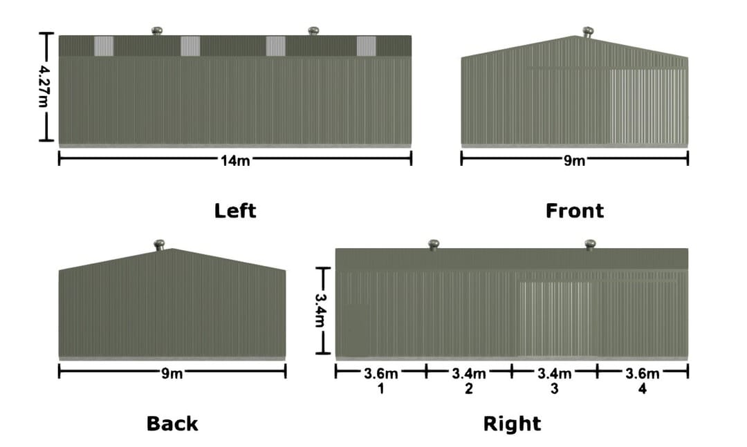 - Dimensions: 14m x 9m x 3.6m