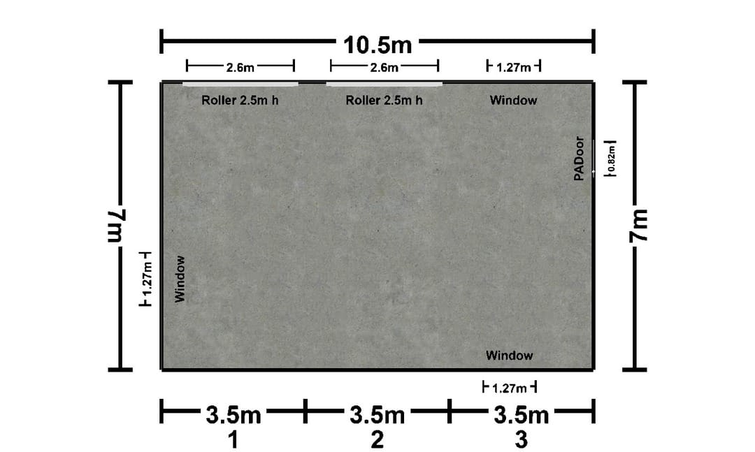 • Dimensions: 7m x 10.5m x 3m